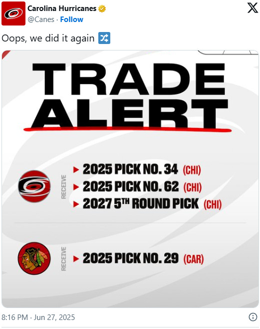 The most interesting thing to happen during the first round of the NHL Draft on Friday was something that’s happened before and will happen again: a very specific type of trade. The repetitive nature of the trade was something Carolina’s occasionally irreverent social media team picked up on.